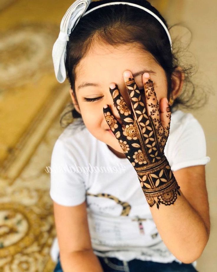 If you want a simple mehndi design for kids with a twist, opt for this geometric style. The main motif in the middle looks beautiful with beautiful finger details!